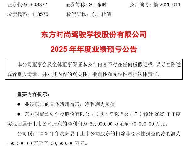 1月20日,ST东时(603377)发布公告,公司预计2025年年度亏损6亿元至7亿元,扣除非经常性损益后的归母净利润预计约亏损5.05亿元至6.05亿元。